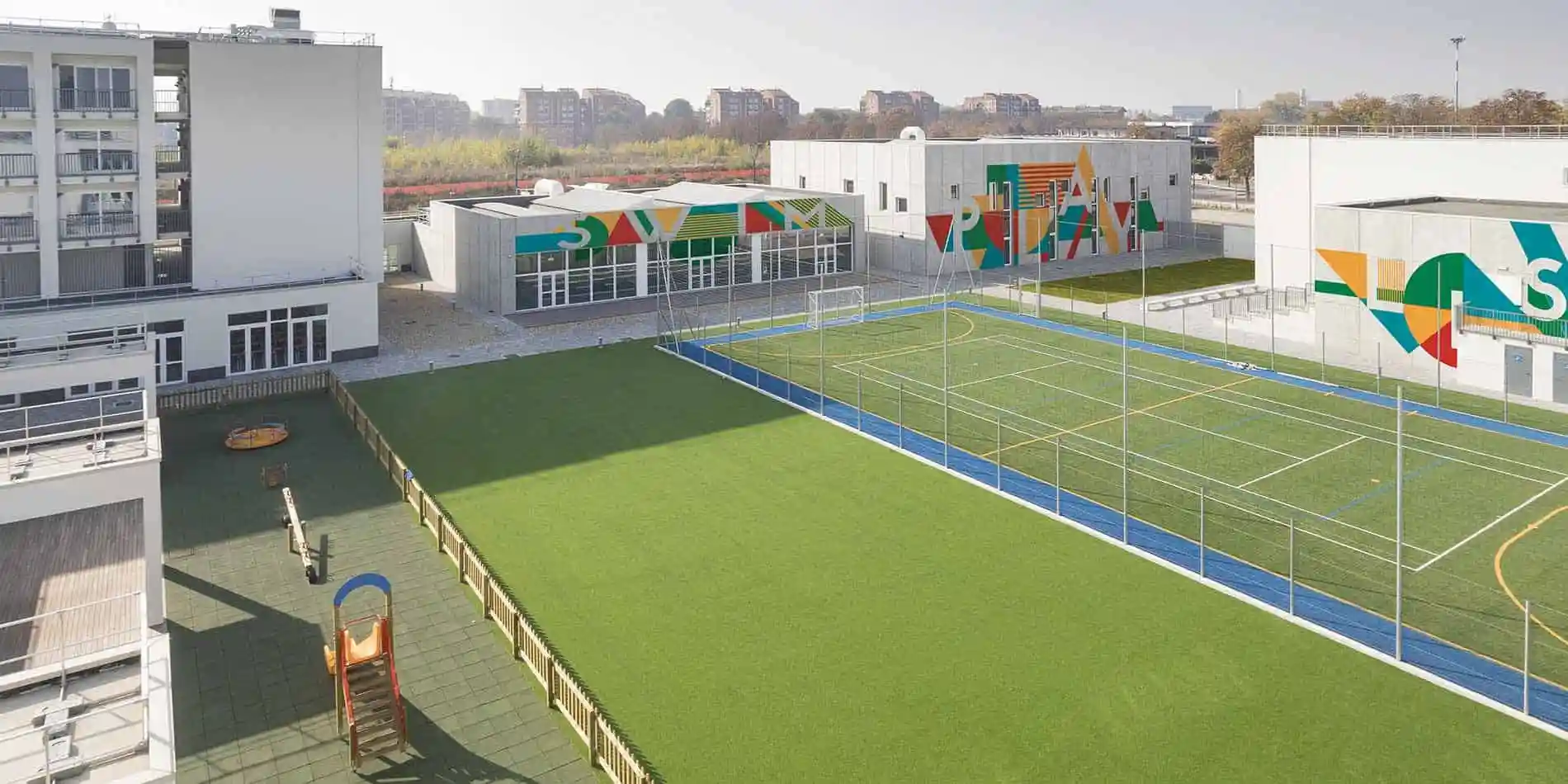 16,000제곱미터 규모의 캠퍼스, 밝고 넓은 교실, 그리고 기술의 통합적 활용은 안전하게 학습하는 데 매우 중요하며, 매일 학교 구내 식당에서 신선한 음식을 제공하여 학생들에게 건강하고 균형 잡힌 삶을 조성합니다.