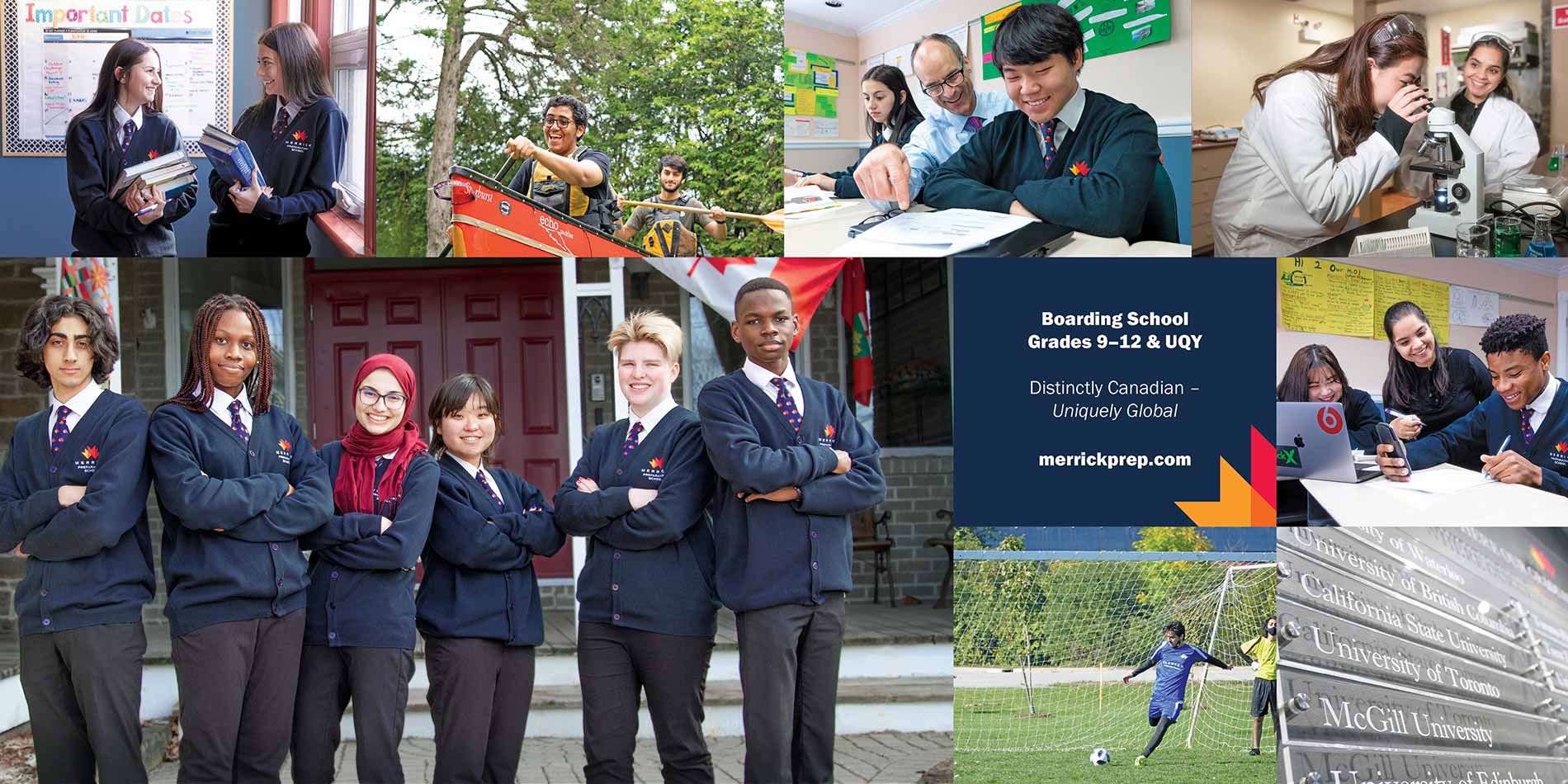 Merrick Preparatory School (MPS) is een dag- en kostschool in het dorp Merrickville, Ontario, aan de oevers van de historische Rideau Waterway, een UNESCO-werelderfgoed. Merrickville, op slechts 45 minuten van Ottawa, de hoofdstad van het land, is twee keer uitgeroepen tot mooiste stad van Canada en MPS heeft toegang tot alle belangrijke voorzieningen van het land voor onze leerlingen. Ons dorp biedt een rustige, veilige plek waar leerlingen zich kunnen concentreren op hun studie, waar veel dorpelingen onze leerlingen bij naam kennen. Met een gemiddelde klasgrootte van tien leerlingen en een maximale capaciteit van 60 kostleerlingen, 20 lokale dagleerlingen en 30 live-online synchrone leerlingen, krijgen onze leerlingen individuele aandacht en ondersteuning van hoogopgeleide, gecertificeerde en toegewijde leerkrachten in een stimulerende, familiaire omgeving. Leerlingen uit meer dan 20 landen maken MPS een typisch Canadese en unieke internationale school. Sinds onze oprichting in 2012 hebben we een acceptatiepercentage van 100% weten te handhaven voor onze afgestudeerden aan universiteiten van wereldklasse. Veel studenten krijgen zelfs een beurs.