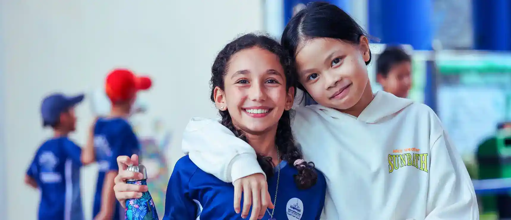 Smiling schoolchildren embracing, showcasing diverse students in a global school environment.