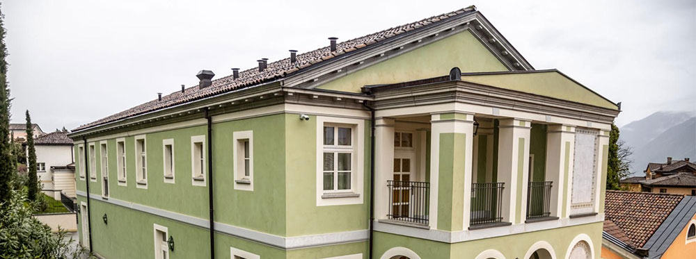 Elegant green school building with classical architectural details and secure balcony, ideal for top-quality education.