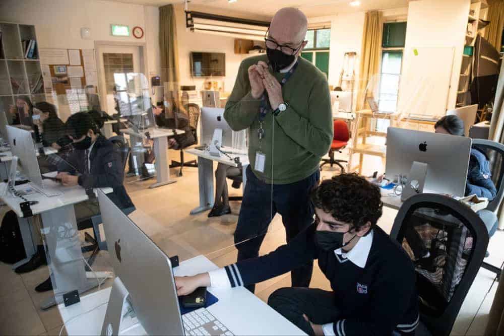 Experienced teacher giving a class at World Schools with students working on computers, promoting advanced learning environments.