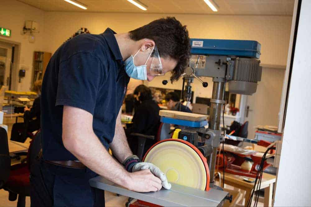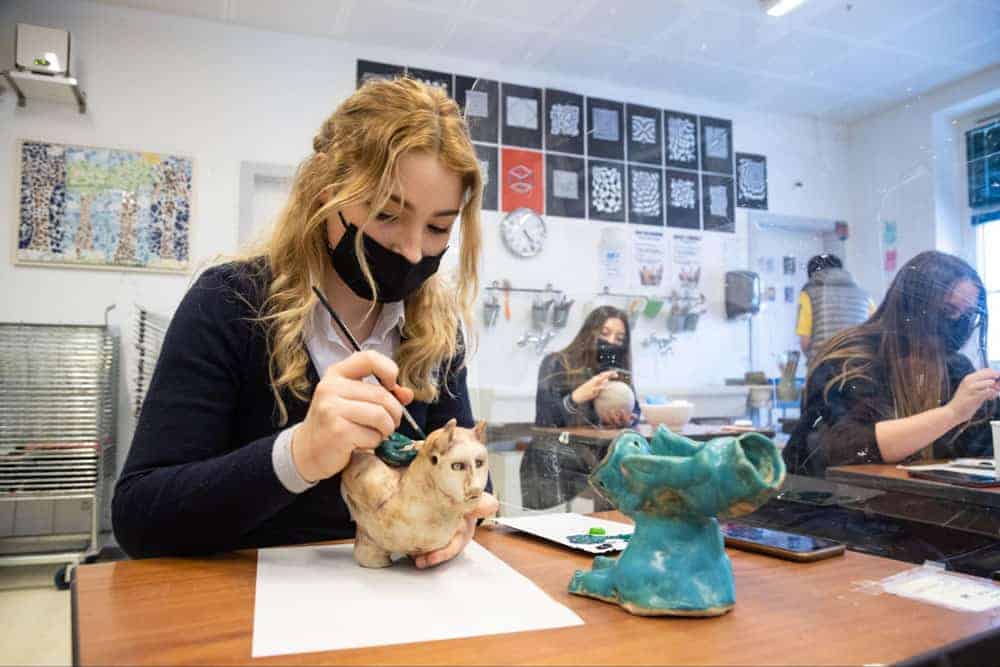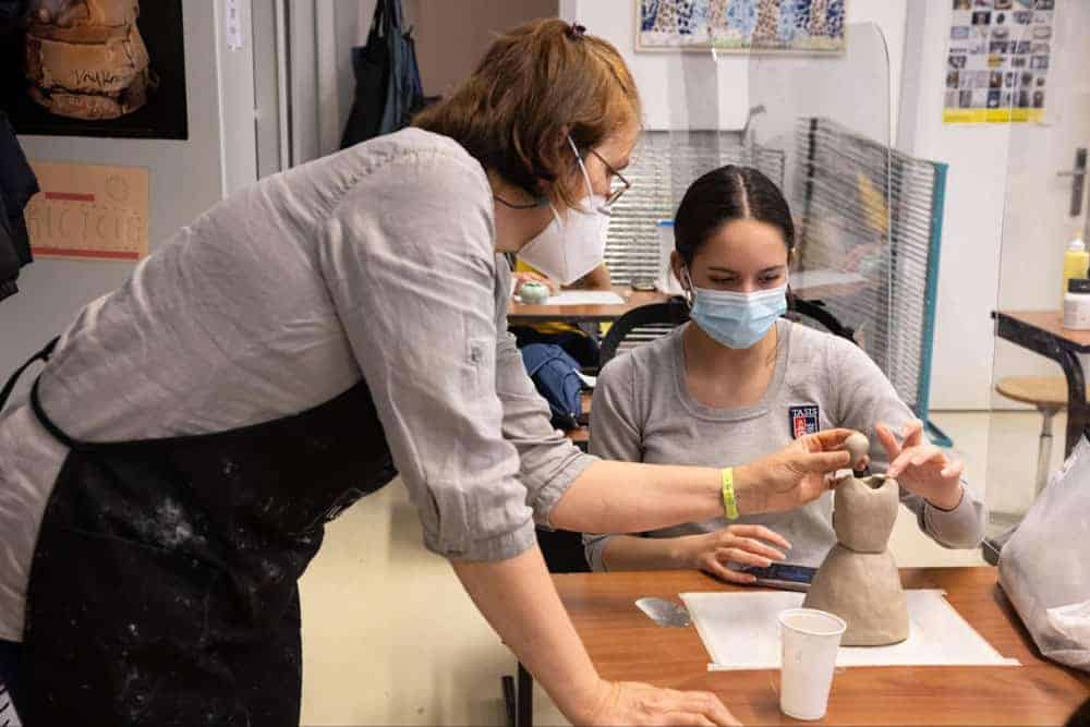 Creative arts class at World Schools, students learning pottery techniques while wearing masks.