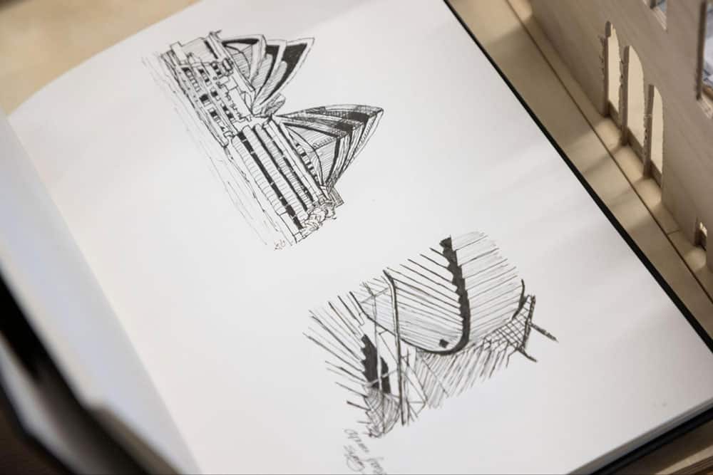 Modern architectural sketches of iconic buildings for World Schools students learning design and architecture.
