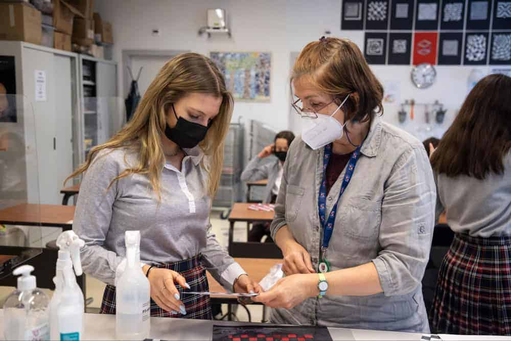 Creative collaboration between a teacher and student in art class at world schools facility.