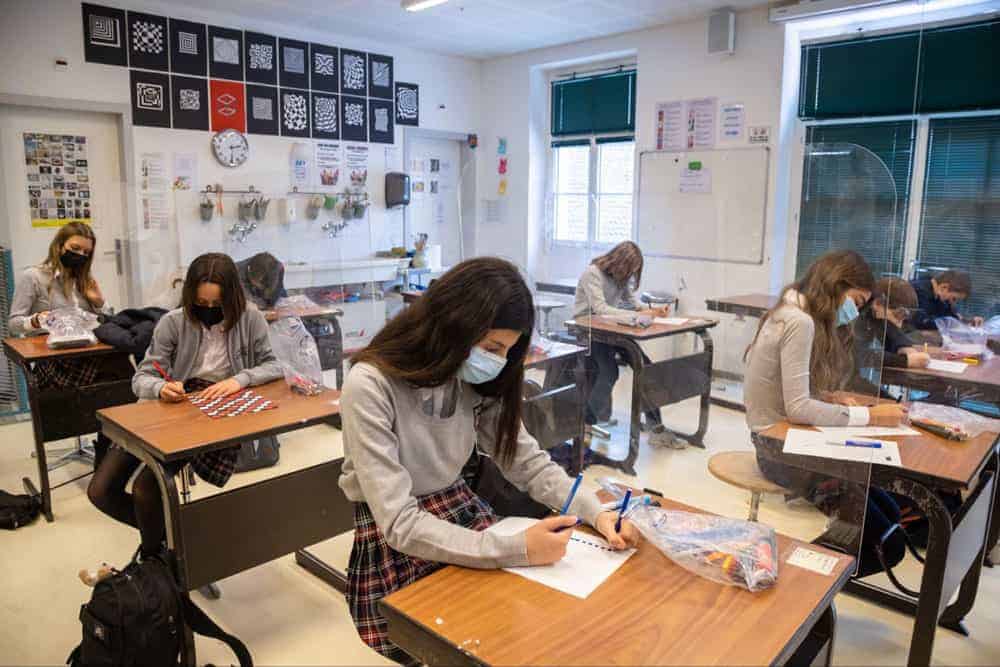 Focused students wearing masks taking exam inside classroom at World Schools.