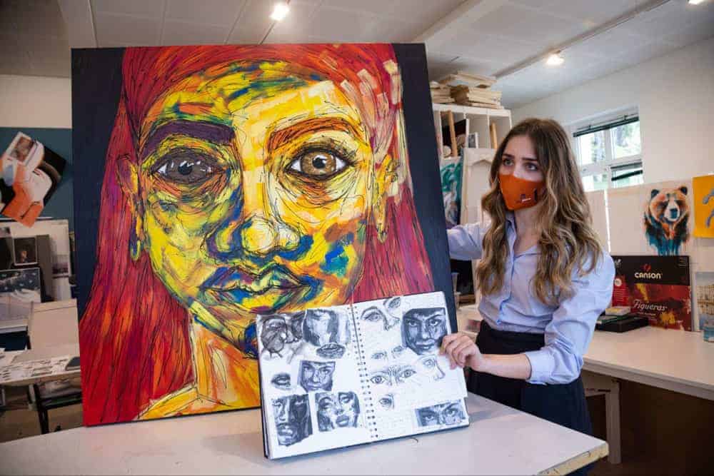 Vibrant portrait art created by student at world school art studio.