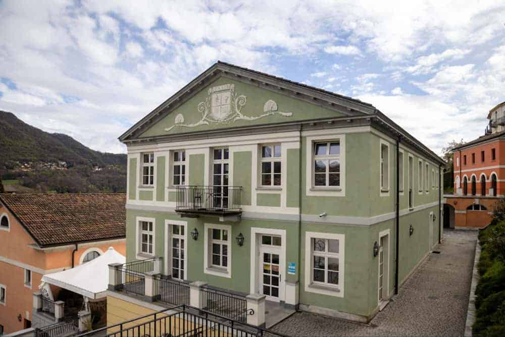 Stunning view of mountains and lake through an elegant archway at World Schools location.