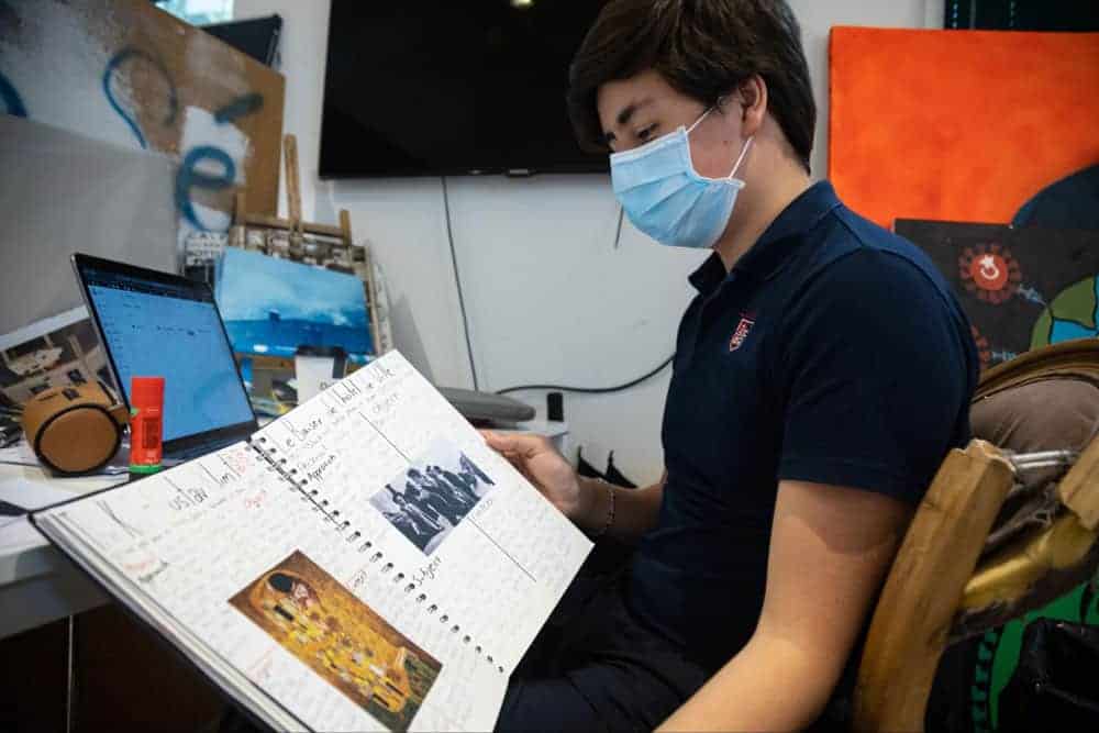 Focused student studying with a scrapbook at a desk, wearing a protective mask in a modern educational environment.