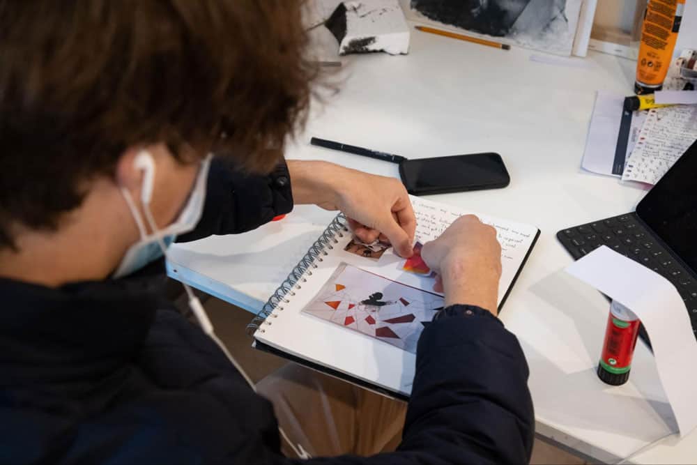 Creative art student working on project in classroom, focusing on design and illustration skills.