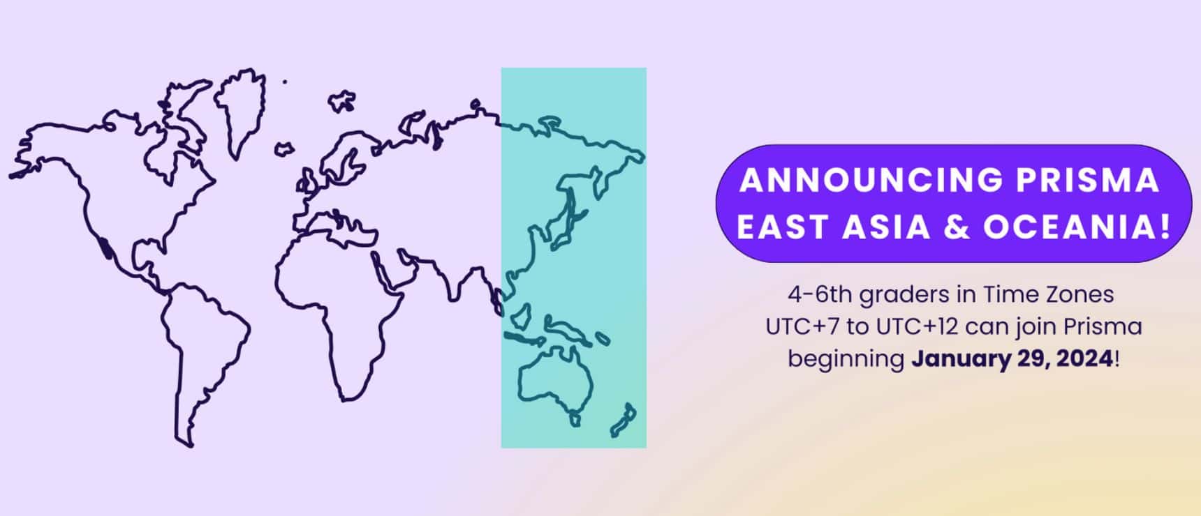 Global map outline with highlighted East Asia & Oceania regions for World Schools Prisma program launch.