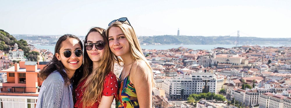 Vibrant international students enjoying city view near famous bridge in Lisbon Portugal.