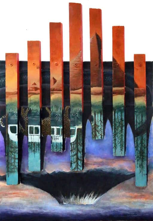 Brian attempted to reveal a “profound unity” between human civilization and the wild in his mixed-media production “Into the Mountain”. Here, the juxtaposed Mount Kilimanjaro and an Egyptian pyramid are split by the bus used by itinerant hiker Alexander Supertramp (the subject of the non-fiction book Into the Wild he studied in his English class). The serpent described by Paul Celan in his poem Death Fugue rattles behind the bus and “runs through the entire fate of the human race.”