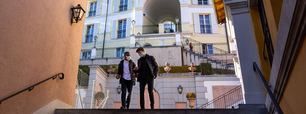 Elegant private school campus with students in masks, modern architecture, and scenic outdoor stairs.