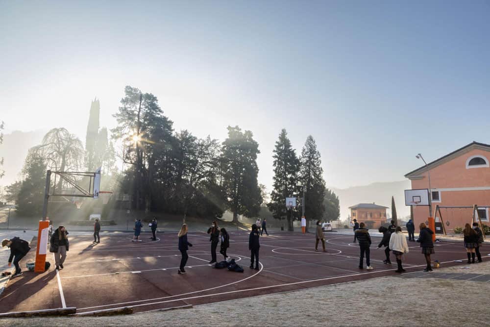 Modern school basketball court at World Schools campus with students playing sports early morning.