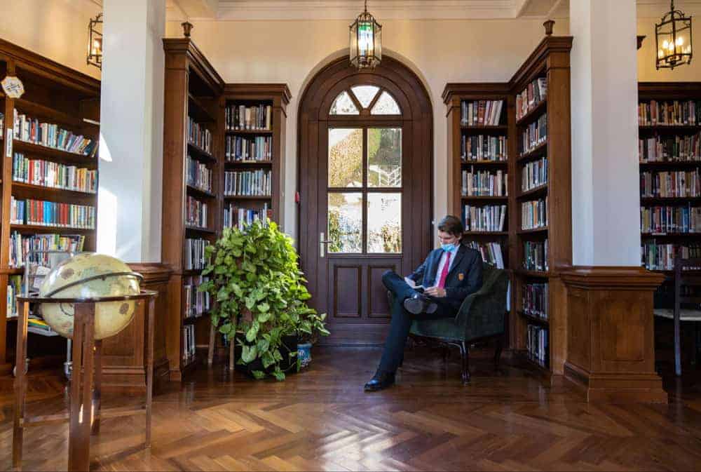 Young student reading in a cozy school library with wooden bookshelves and natural light for private study.