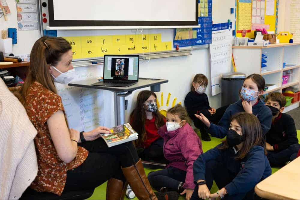 Grade 3 students gathered around Ms. Laura Pearsall as she read another chapter from The Absent Author, a tale of kidnap and mystery. Students in the classroom and on hybrid learning honed their reading comprehension skills while listening carefully for clues that could help solve the mystery.