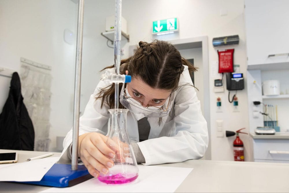 1. Female student conducting chemistry experiment in laboratory for science education.