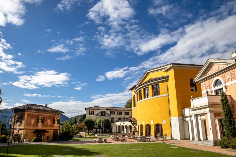Luxurious world school campus with vibrant yellow buildings in picturesque landscape.