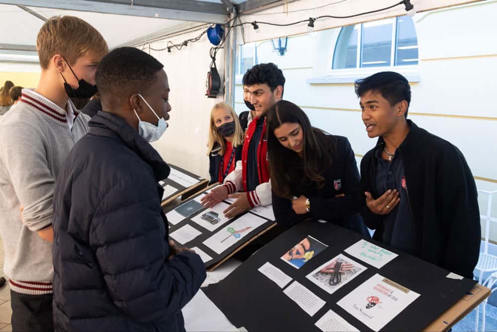 Diverse students engaging at a school project display booth, promoting international education and global school community.