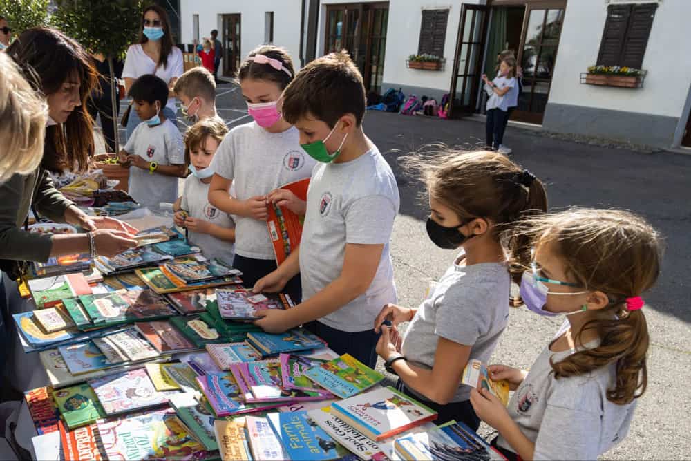 Colorful books displayed outdoors at a school event with children and teachers, promoting world-class education.
