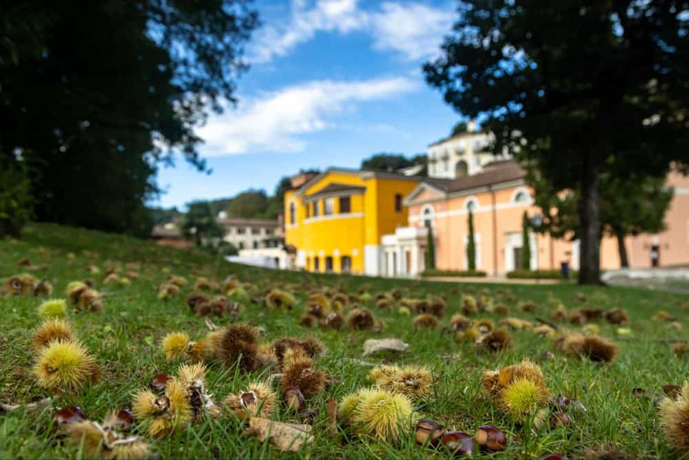 Schooling landscape with vibrant architecture and a lush green field filled with chestnuts.