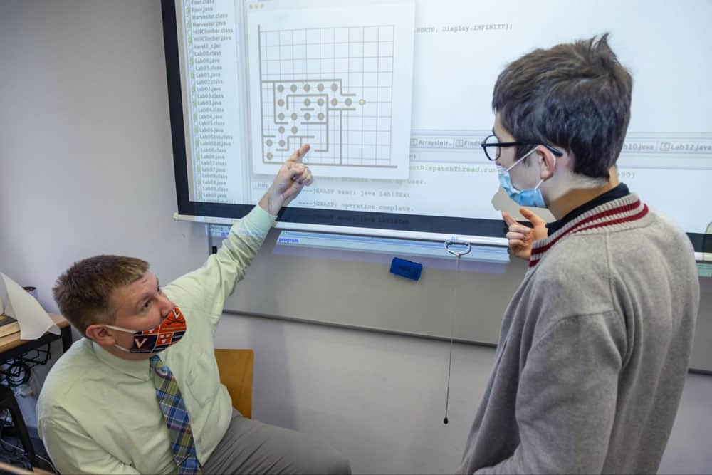 Mr. Isaac Carey and an AP Computer Science student discussed how to program a robot to navigate a maze during class on October 20.