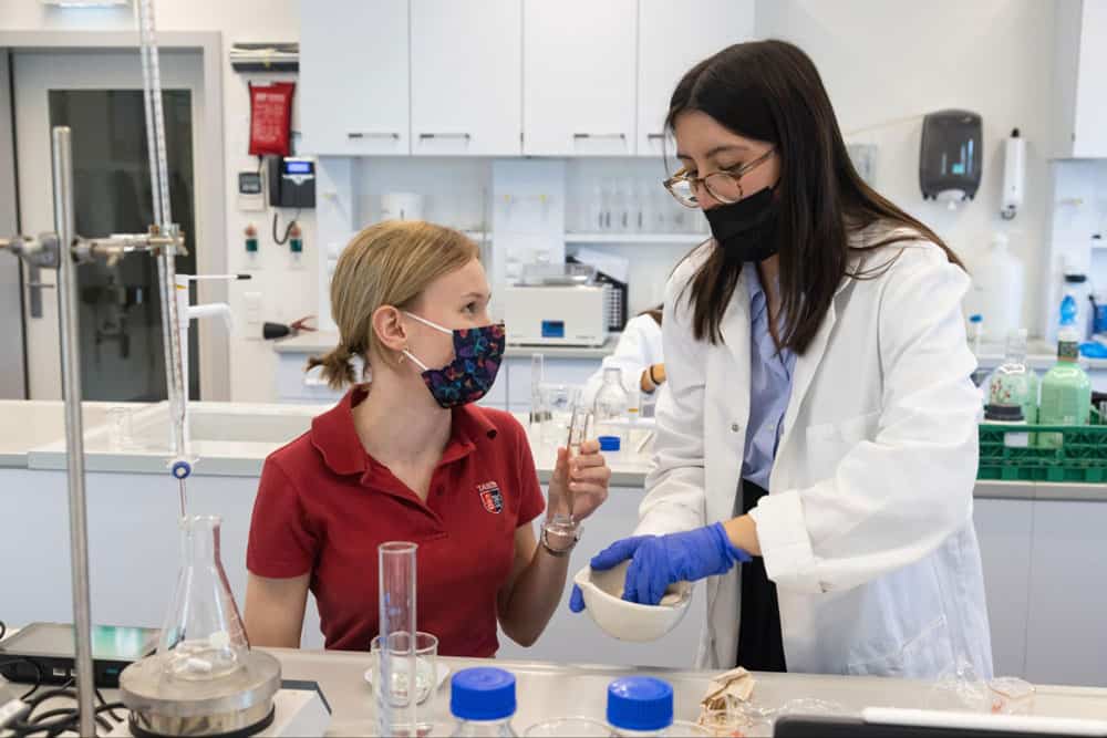 Two second-year IB Biology students worked together to create natural acid-base indicators from flower petals and tested their effectiveness on October 21 in the Campo Science Center’s Helsinn Chemistry Lab.