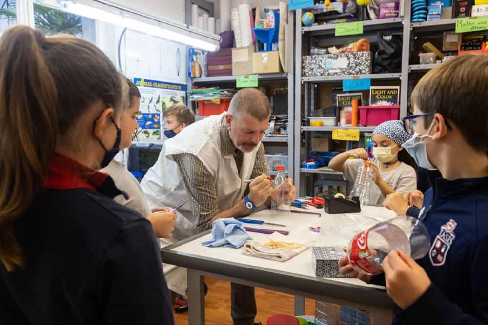 Fourth-grade students used plastic bottles, matchsticks, and strands of hair to build hygrometers during Mr. Laurent Carsana’s class on October 21.