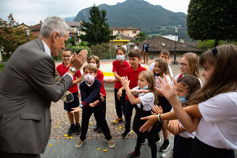 With the iconic MCF Piazza Fountain still surrounded by yellow rose petals, Headmaster Christopher Nikoloff shared a lighthearted moment with fourth-grade students later that afternoon.