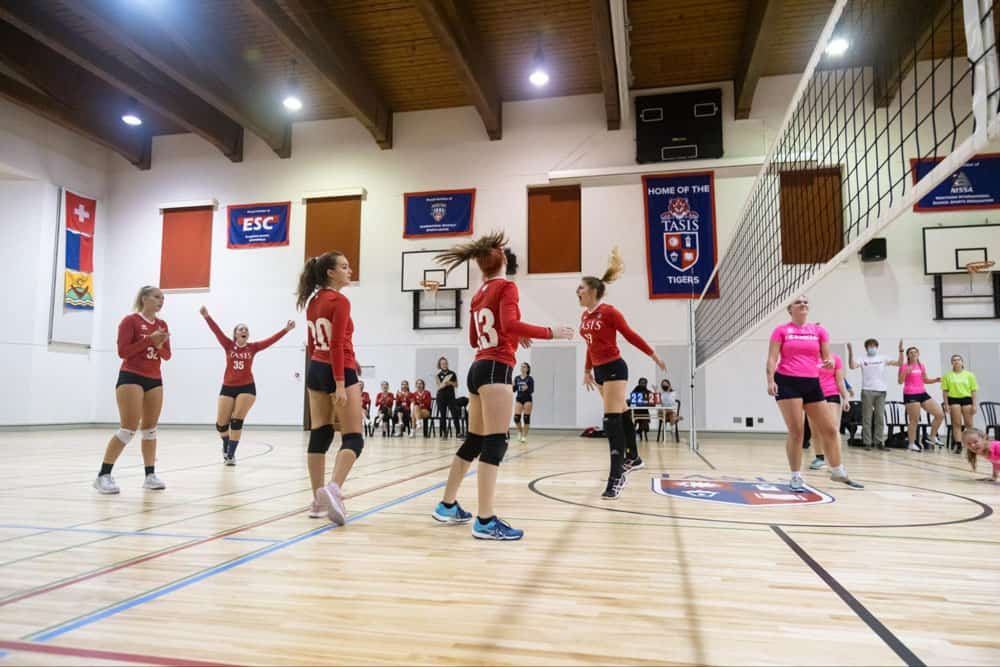 Members of the TASIS Girls Varsity Volleyball team celebrated a pivotal point over Franklin University in the recently resurfaced Palestra on October 5.